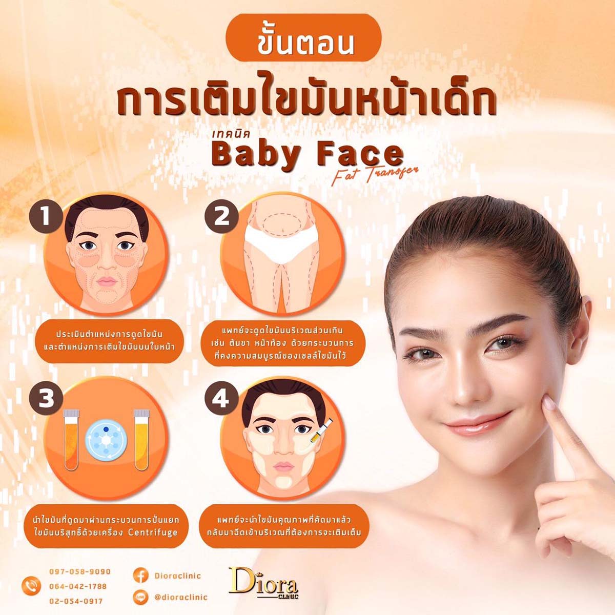 นอกจากนี้เทคนิคการเติมไขมันหน้าเด็กที่ Diora Clinic ยังช่วยให้ไขมันอัตราการรอดชีวิตมากกว่าปกติ เพื่อช่วยแก้ไขปัญหาหน้าแก่ก่อนวัย หน้าโทรม หน้าตอบ ริ้วรอยร่องลึก และสามารถเข้าถึงจุดที่เข้าถึงยากและบอบบางมาก เช่น ใต้ตา ทำให้ใบหน้ากลับมาดูเด็กลง หน้าอิ่มฟูดูสุขภาพดีมากขึ้น